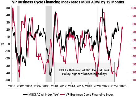 Finally, and by contrast, our diffusion index of central bank activity - the VP BCFI - shows the breadth of easing cycles is supportive of continued equity gains.