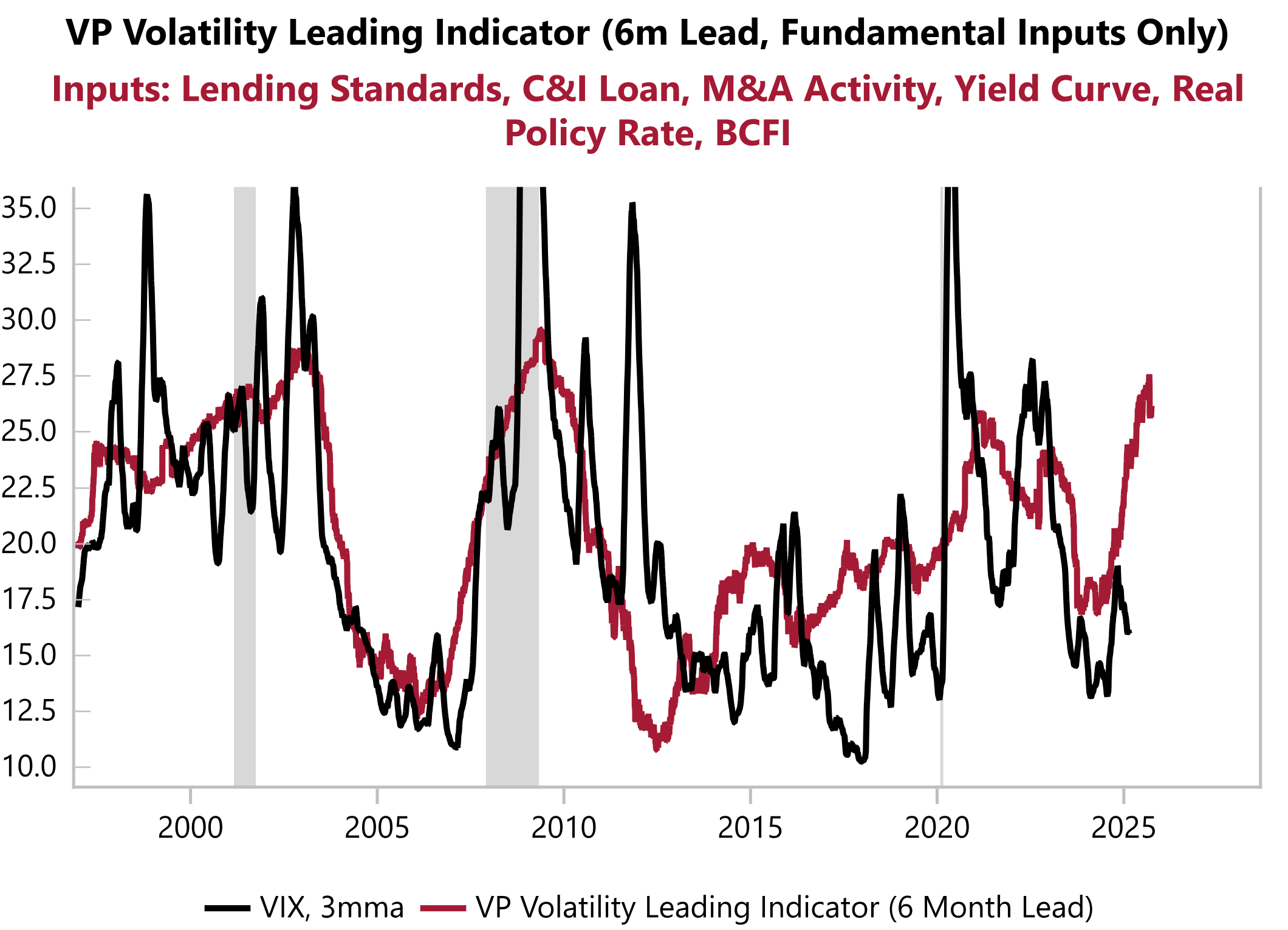 Taken together, these indicators suggest overall liquidity is a headwind for asset prices. We reaffirm our call to selectively add long volatility exposure, consistent with our leading indicator for volatility pointing higher.
