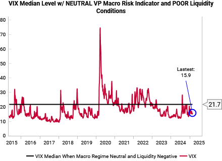Liquidity is the main negative drag on our VP Macro Risk indicator, which overall remains in a “neutral” regime. The low volatility in equity markets is at odds with this backdrop of negative liquidity and a neutral risk indicator.