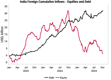We also expected the rupee and Indian equities to benefit from a pickup in foreign inflows that reversed abruptly after President Trump imposed 50% tariffs in August. For now, Indian equities lack a catalyst, so we are taking profit on our trade initiated in February (link).