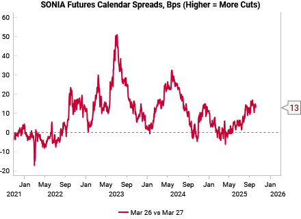 What looks mispriced to us is what happens after March. The March 26-27 SONIA (SFIH6H7) spread is only discounting 13bps right now. If we are right that disinflation is on the way and that the UK growth picture remains ugly, then there is plenty of scope to price in more cuts and for this spread to widen.