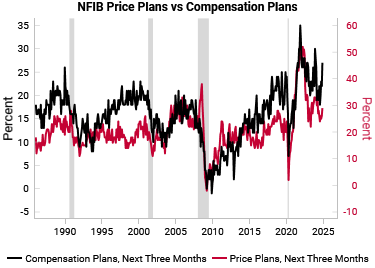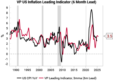 Our US inflation leading indicator still shows inflation settling above target with a 6-month forward point estimate of 3.5% YoY. It is also notable that we are starting to see a rebound in various price surveys, such as the recent rise in the NFIB price plans and compensation plans.