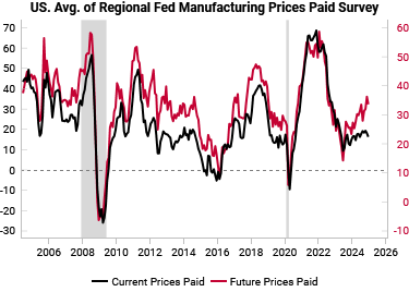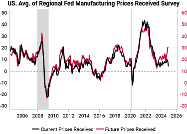 The regional Fed manufacturing surveys are showing a notable pick up in future price expectations, for both prices paid and prices received.