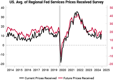 The regional Fed services surveys are showing a less dramatic uptick in price expectations, but these also look to be bottoming.
